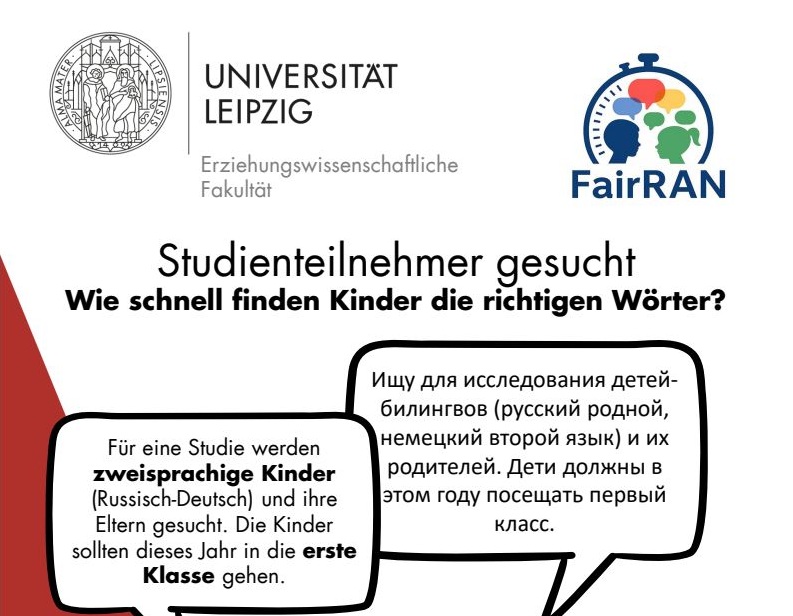 Die Studie richtet sich an Kinder mit Russisch als Erst- und Deutsch als Zweitsprache, die die 1. Klasse besuchen. In der FairRAN-Studie wird eine Aufgabe zum schnellen Bildbenennen für die Sprachentwicklungsdiagnostik untersucht. Die Erkenntnisse der Studie sollen dazu beitragen, die Entwicklungsdiagnostik für mehrsprachige Kinder in Zukunft fairer zu gestalten. Für das Projekt liegt ein positives Votum des Ethikbeirates der Universität Leipzig vor.