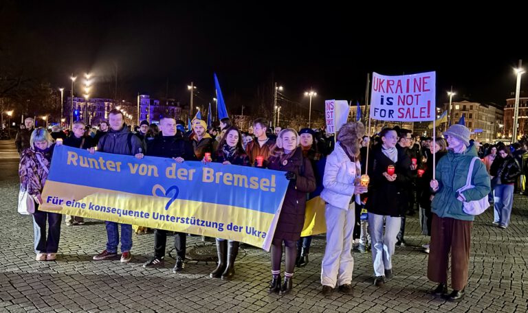 Шествие началось в историческом центре города, где сотни людей развернули транспаранты и флаги. Основное внимание привлек главный баннер с лозунгом «Runter von der Bremse! Für eine konsequente Unterstützung der Ukraine» («Хватит тормозить! За последовательную поддержку Украины»). Этот лозунг стал четким сигналом политическому руководству о том, что гражданское общество Лейпцига ожидает более решительных и последовательных шагов в оказании помощи.