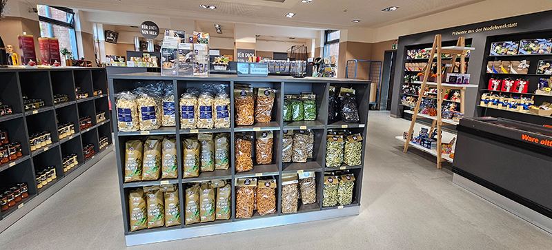 Первое место, которое мы посетили, стал фирменный магазин фабрики. По его богатому ассортименту можно представить все разнообразие продукции, которую выпускает предприятие. 65 видов изделий — от привычных спагетти, спиралей и «бантиков» до макарон-чипсов, лапши с ароматами тыквы, шпината, томата, чили, имбиря, чеснока, а также изделий, окрашенных чернилами каракатицы. На полках магазина можно найти и другие товары, которые сопутствуют употреблению макарон: различные соусы, специи. Магазин стал своеобразной выставкой, где можно не только приобрести макаронные изделия, но и сделать селфи в фотозонах, на фоне нарядных упаковок или необычных вытянутых кукол.