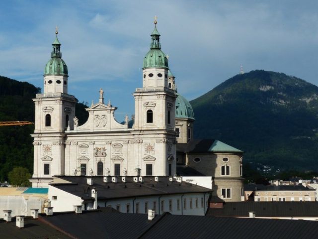 Мы направляемся к Домскому собору. Он был возведен по проекту итальянского зодчего Сантино Солари в 1628 году. Архитектор происходил из талантливой семьи: один его родственник Антонио Солари построил Кремлевскую стену в Москве, другой – Игнацио Солари – расписал фрески свода Домского собора. Они изображают сцены из жизни Иисуса Христа и страсти Господни. Здесь венчались родители Вольфганга Амадея Моцарта. Знаменитый композитор, родившийся 27 января 1756 года, был крещен в купели собора 28 января. Старинная купель, покоящаяся на бронзовых львах, датируется 1321 годом. На здешнем органе играл Моцарт. Инструмент с 10 тысячами труб – второй по величине в Австрии после венского.