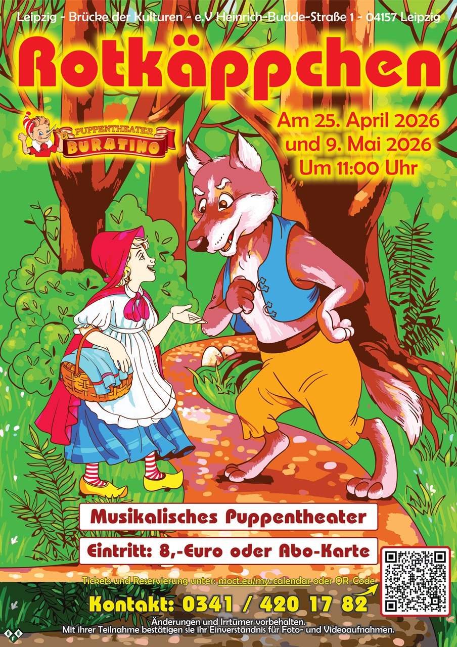 25.04 та 09.05.2026 обидві вистави «Червона Шапочка» відбудуться в нашому ляльковому театрі «Буратіно» німецькою мовою.